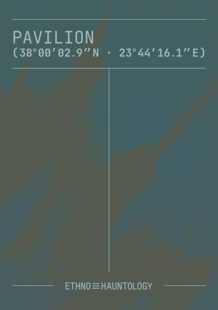Pavilion (38°00′02.9″ N · 23°44′16.1″ E) is a portal that opens at a precise point on the map to interrogate what cannot be fixated: persistences, residues, the resonances of the past in the present, and the foretelling of cancelled futures. Presented within the Etno☰hauntology vol. 1 festival, dedicated to the intersection of cinema and the visual arts, the exhibition translates the conceptual and aesthetic framework developed in the Etno☰hauntología manifesto, originally published in the journal Fantasma Material in 2024.